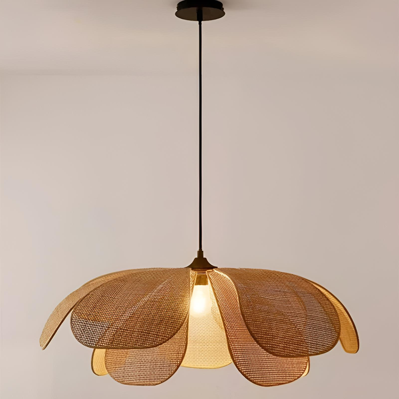 Lyft inredningen med denna handgjorda pendellampa i rotting med unik blombladsdesign. Den sprider ett mjukt och varmt ljus som skapar en inbjudande atmosfär i matsal, vardagsrum, sovrum eller hall. Med sin naturinspirerade stil blir lampan både en dekorativ inredningsdetalj och en funktionell ljuskälla.