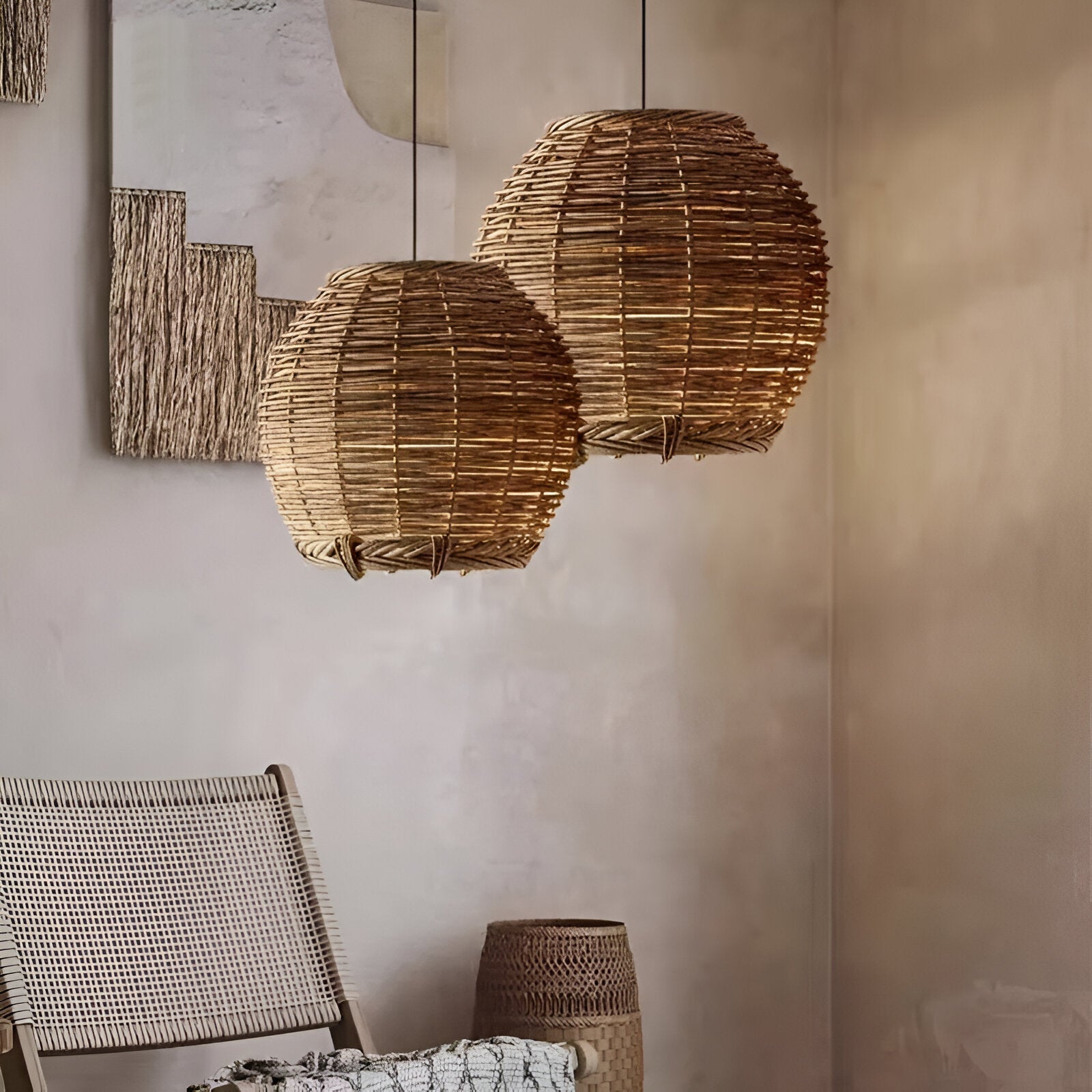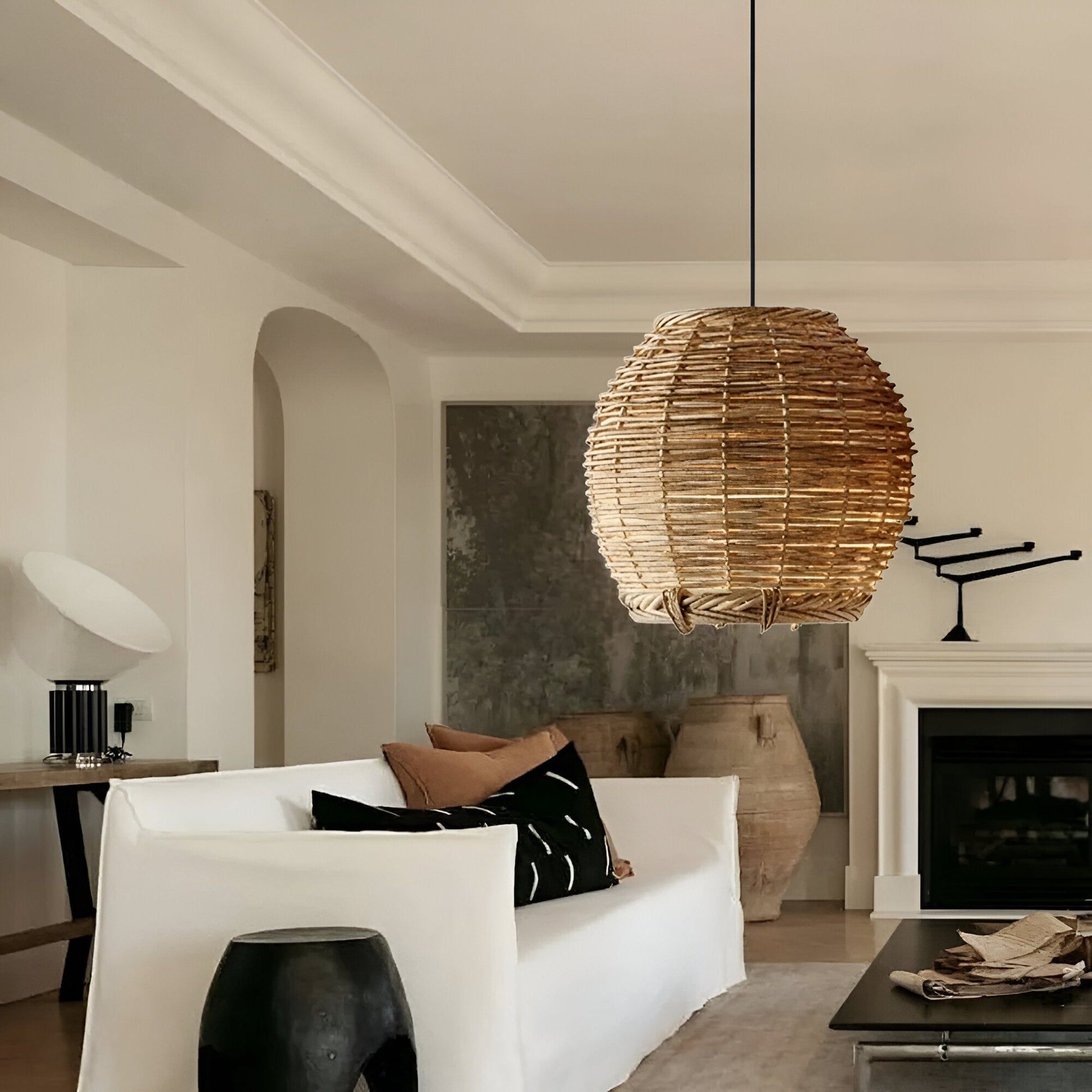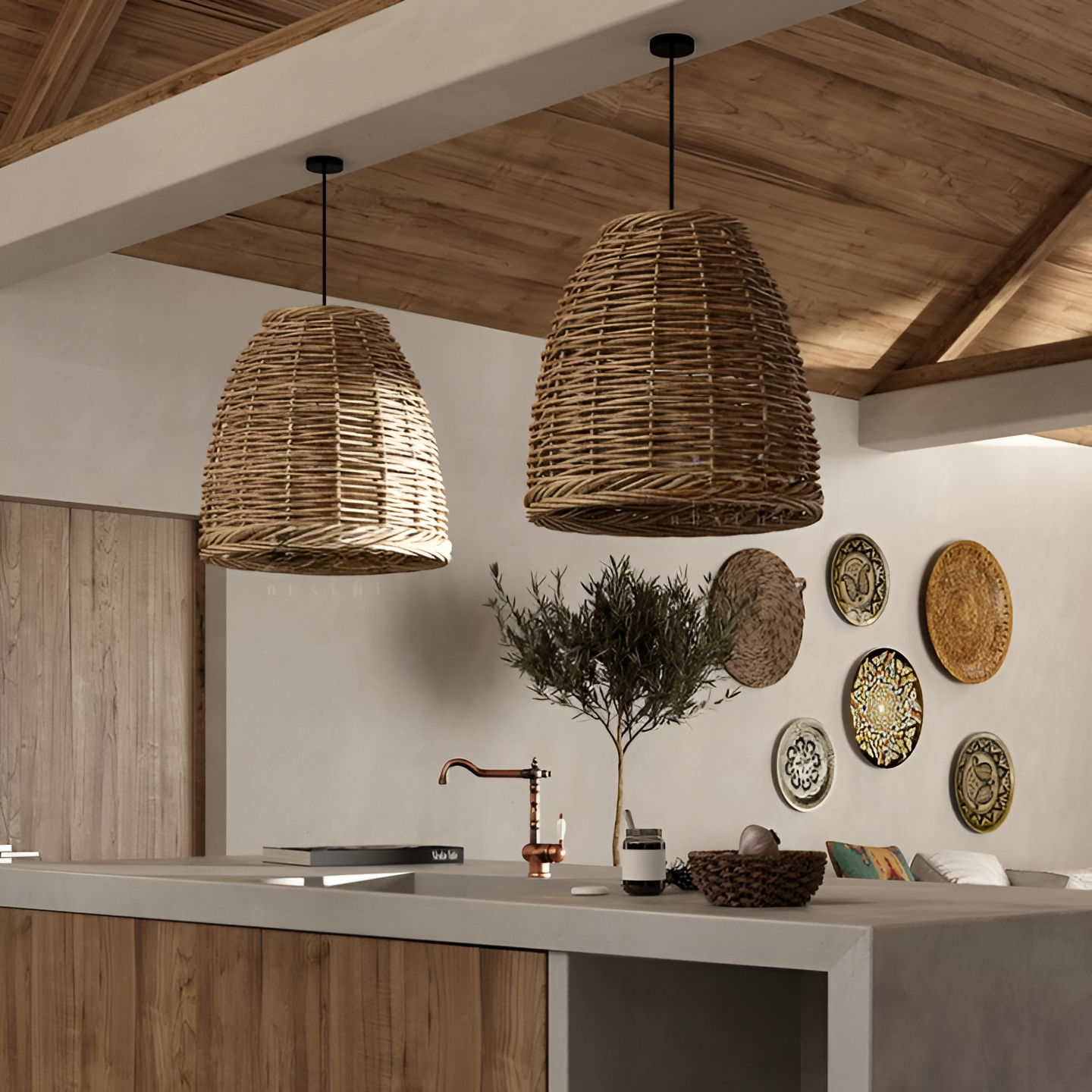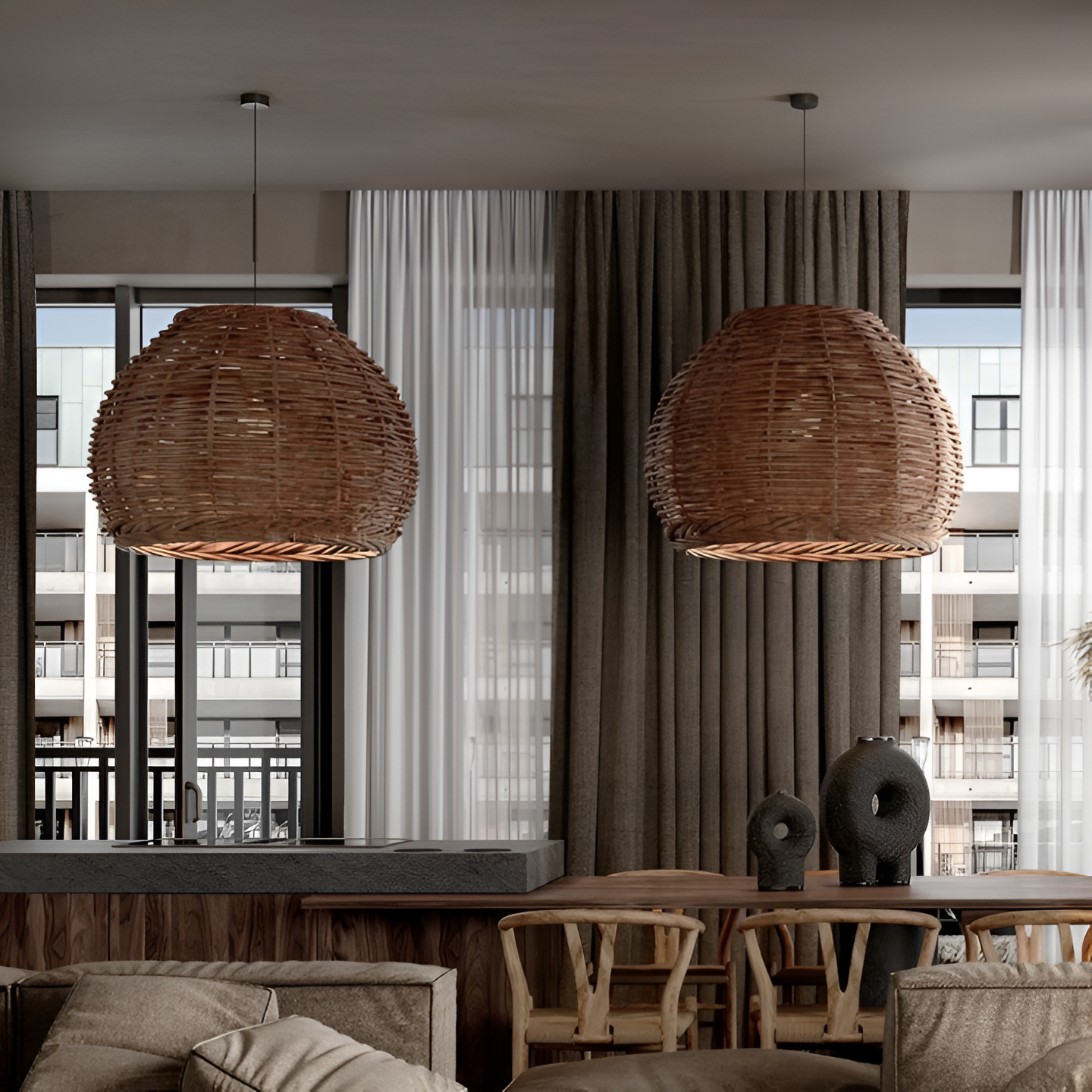 Skapa en varm och harmonisk känsla i ditt hem med denna minimalistiska taklampa i wabi-sabi-stil. Den handgjorda rottingskärmen sprider ett mjukt och behagligt ljus, perfekt över matbordet, i köket, vardagsrummet eller i ett mysigt café- eller restauranghörn. Lampans höjd kan enkelt justeras upp till 1,5 m för att passa olika takhöjder.