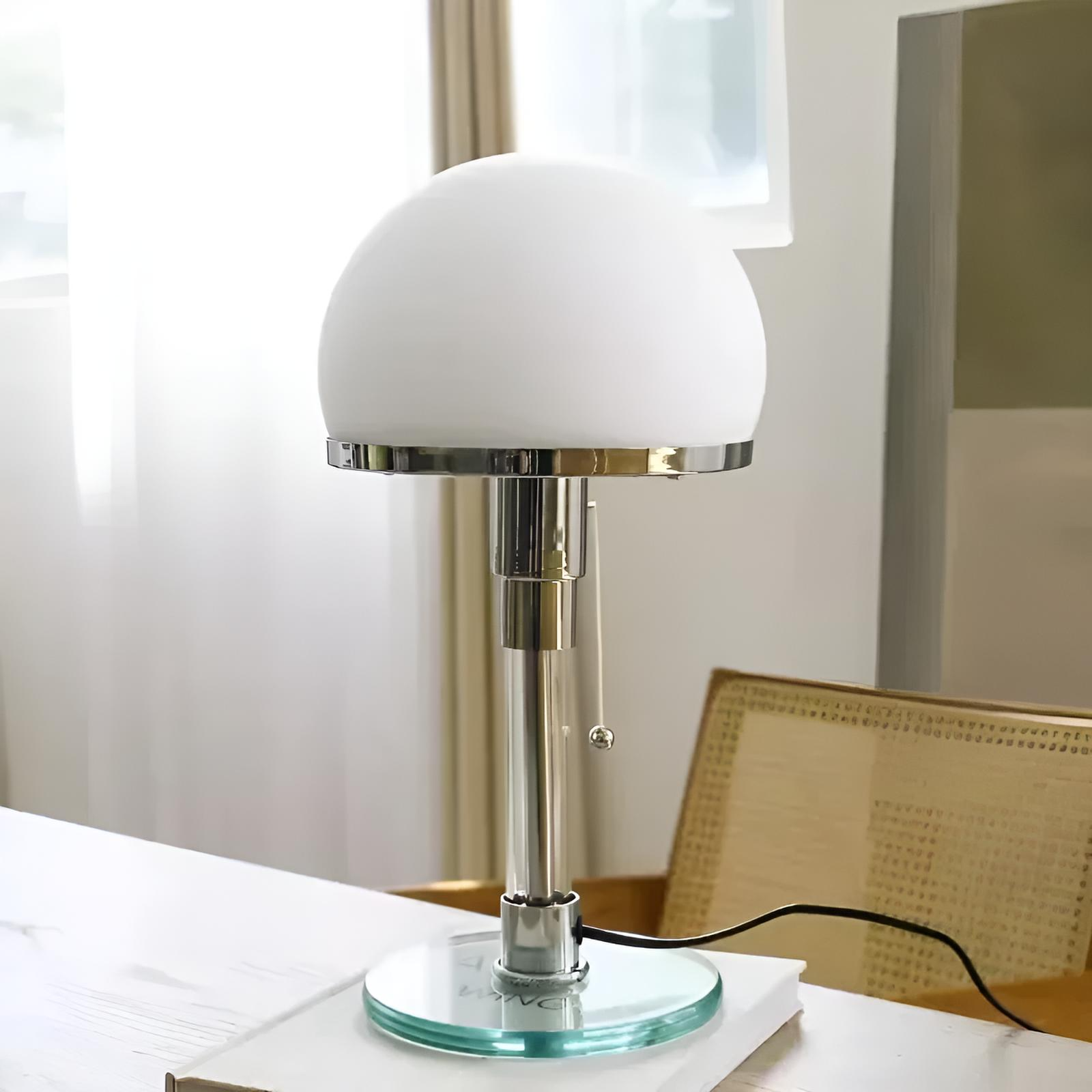 Den runda kupan i glas sprider ett mjukt och behagligt ljus, perfekt för att skapa en harmonisk atmosfär i sovrum, vardagsrum eller på skrivbordet. Lampans stilrena uttryck gör den lätt att kombinera med olika inredningsstilar, samtidigt som den fungerar både som dekorativ detalj och funktionell belysning.