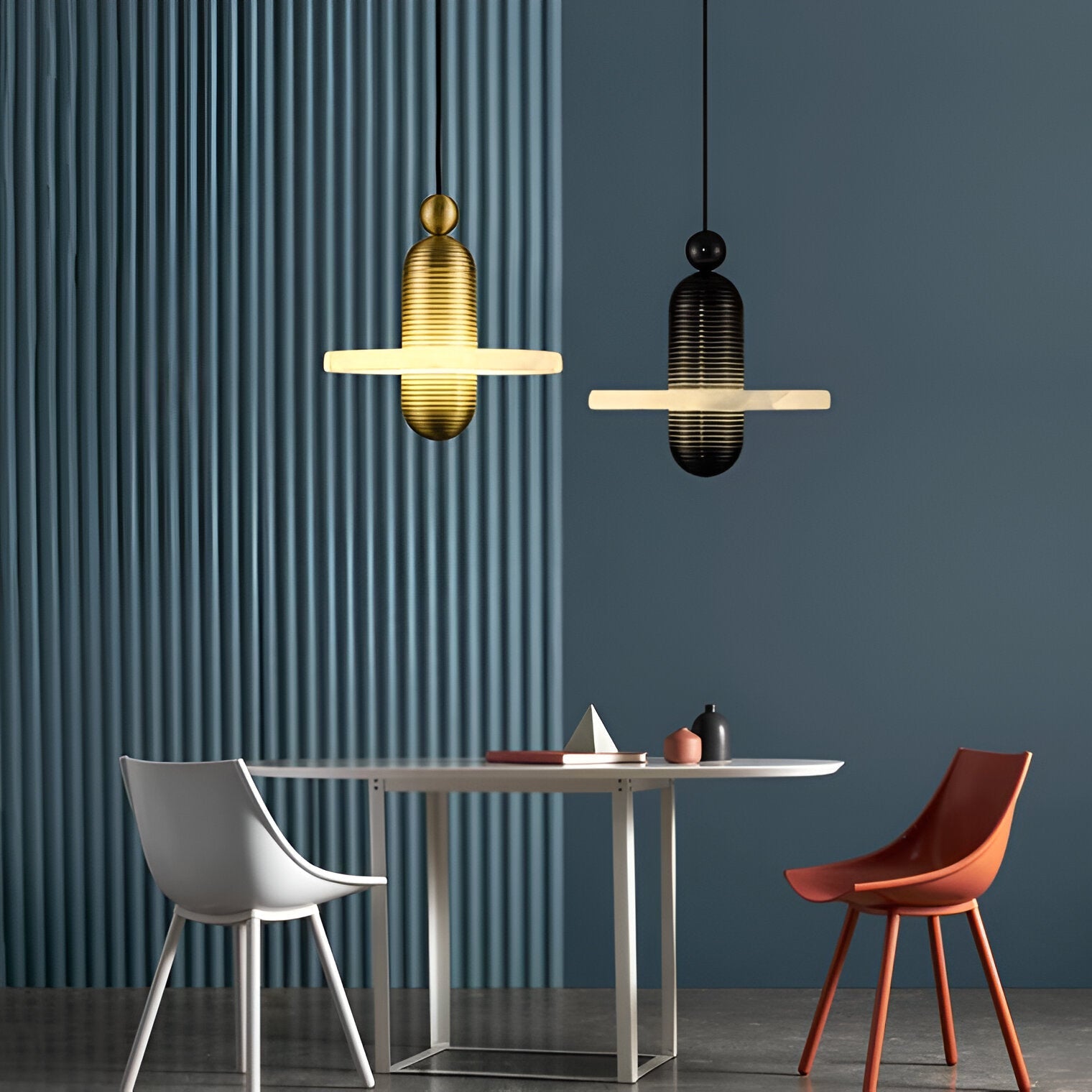 Skapa en varm och sofistikerad atmosfär med denna moderna taklampa som kombinerar en robust järnram med en vacker marmorliknande alabasterskärm. Den stilrena designen passar perfekt över matbord, i vardagsrum, sovrum eller lounge och sprider ett mjukt, inbjudande ljus.