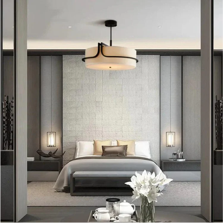 Modern LED-takpendel i tyg med svart ram – elegant för stora rum