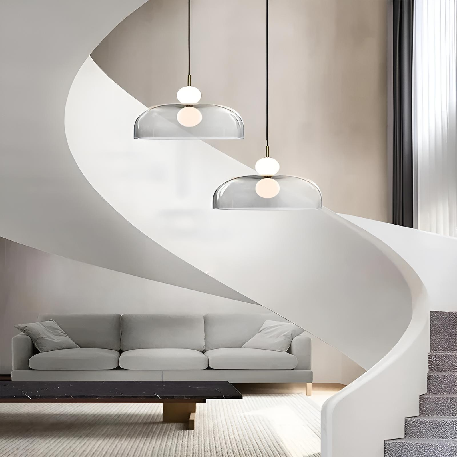 En modern pendellampa i glas som kombinerar stilren design med dekorativa detaljer. Lampan består av dubbla kupor med runda glaselement som skapar en exklusiv känsla i rummet.