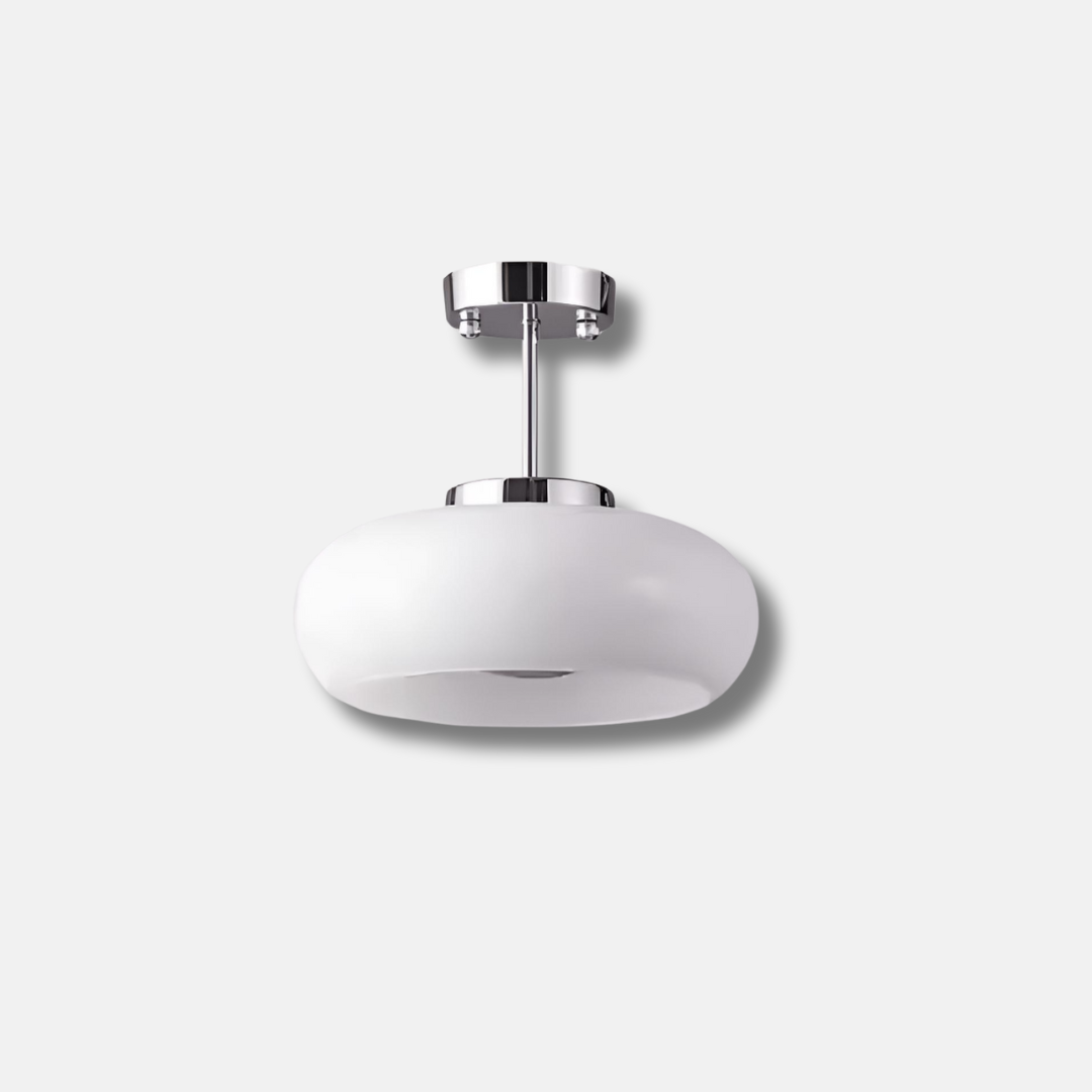 Denna taklampa i retro stil kombinerar klassisk formgivning med modern känsla. Den kupolformade glasskärmen sprider ett mjukt och behagligt ljus som passar perfekt i vardagsrum, sovrum, korridor eller kök.