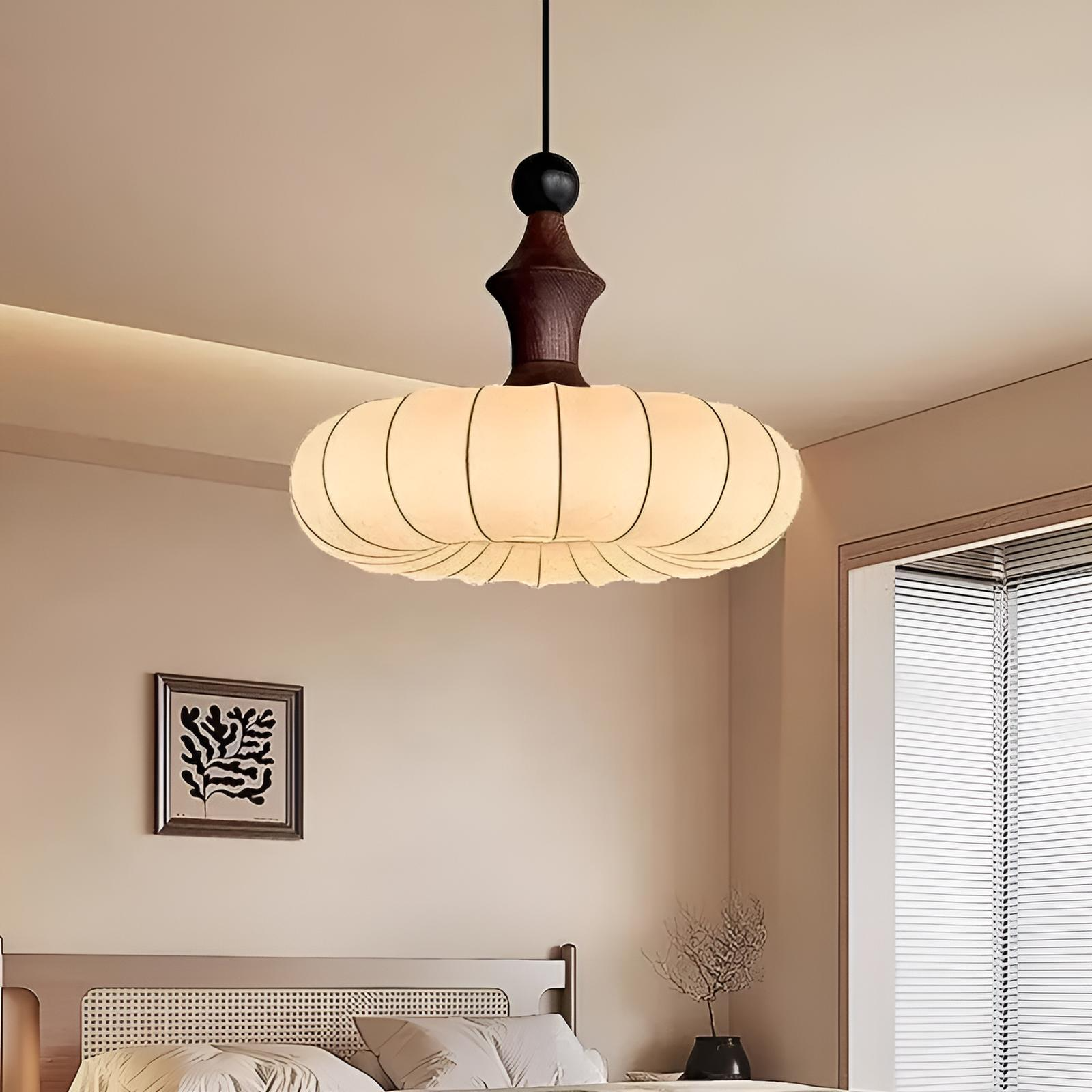 Denna eleganta pendellampa i Wabi-Sabi stil kombinerar mjukt silkestyg med naturliga trädetaljer och skapar en varm och harmonisk atmosfär.