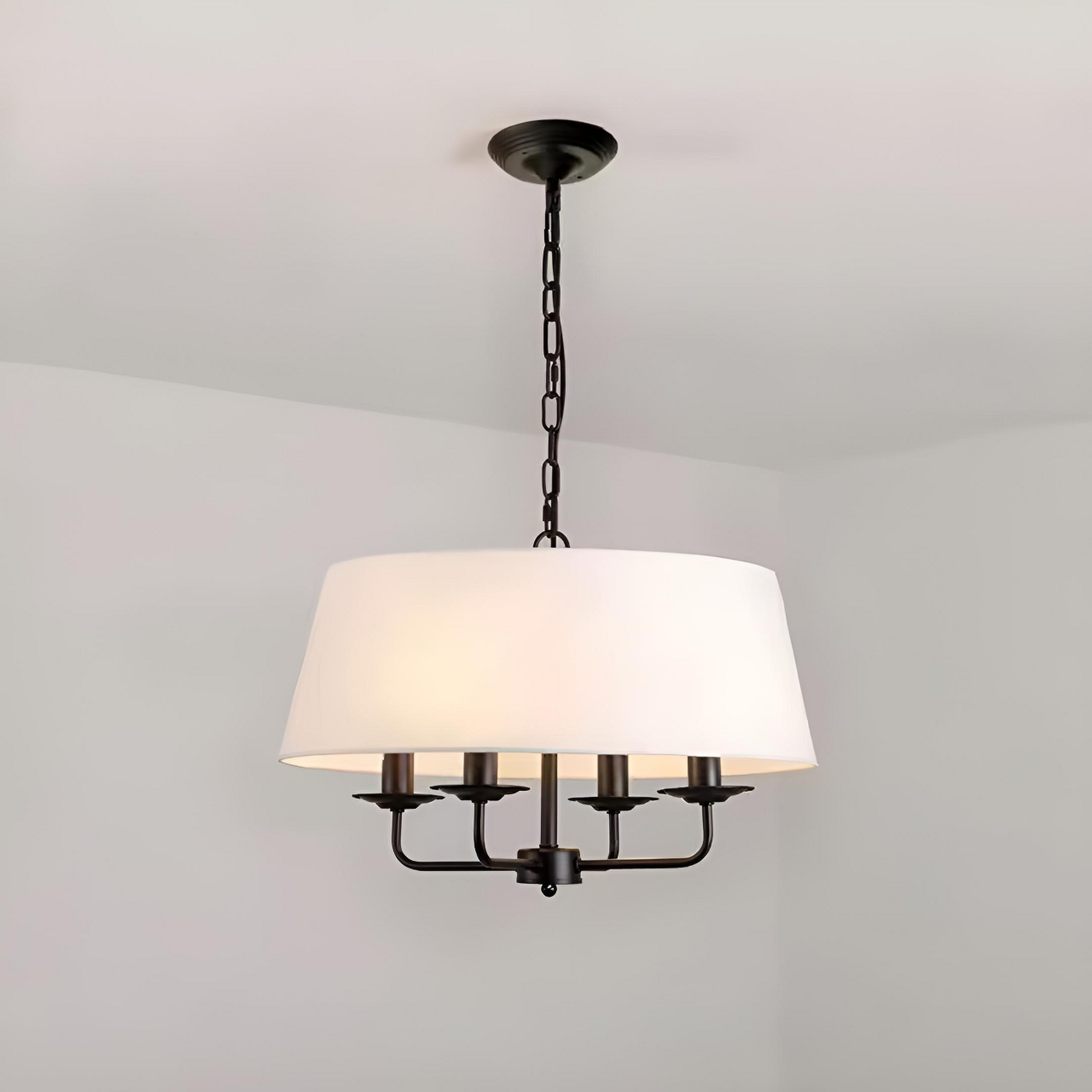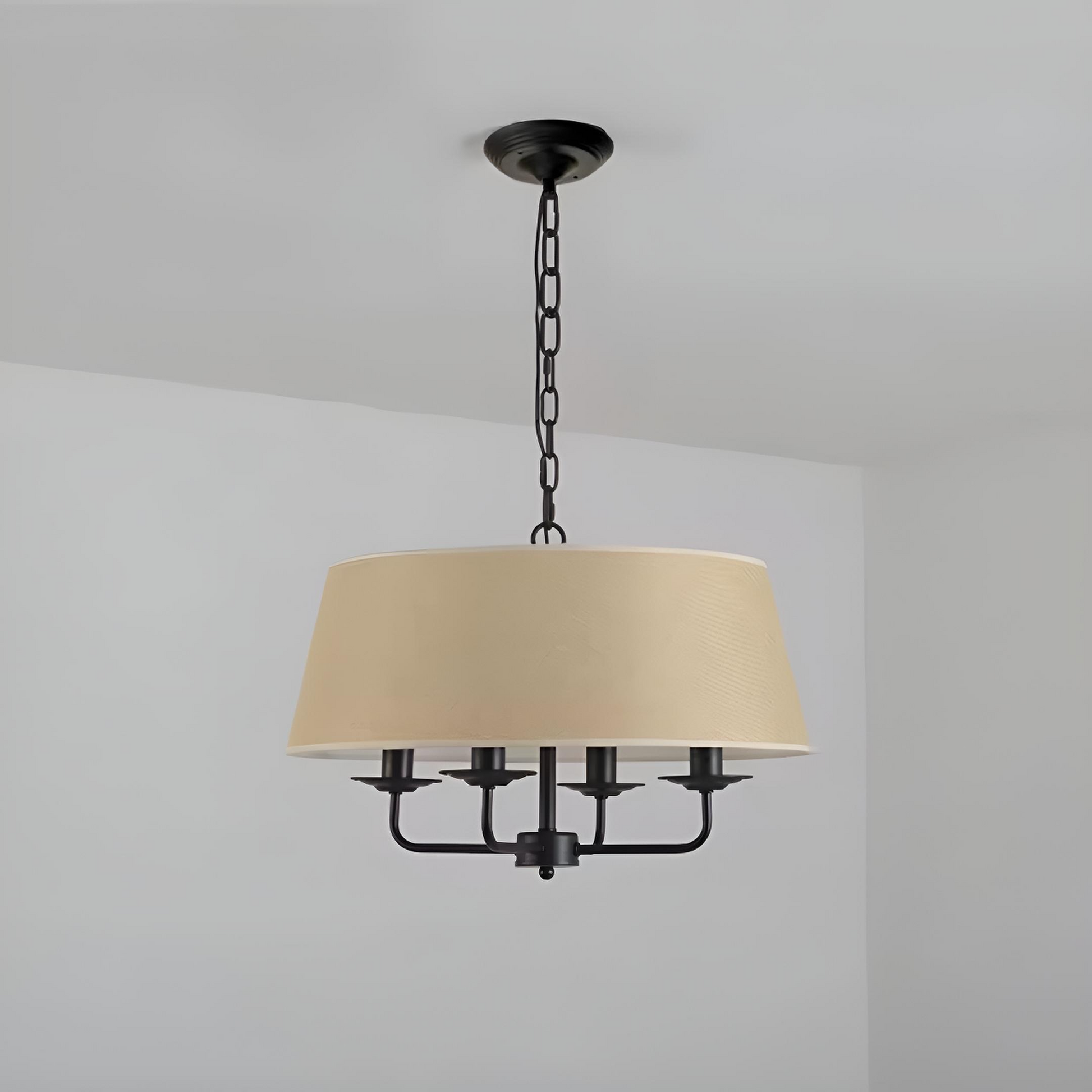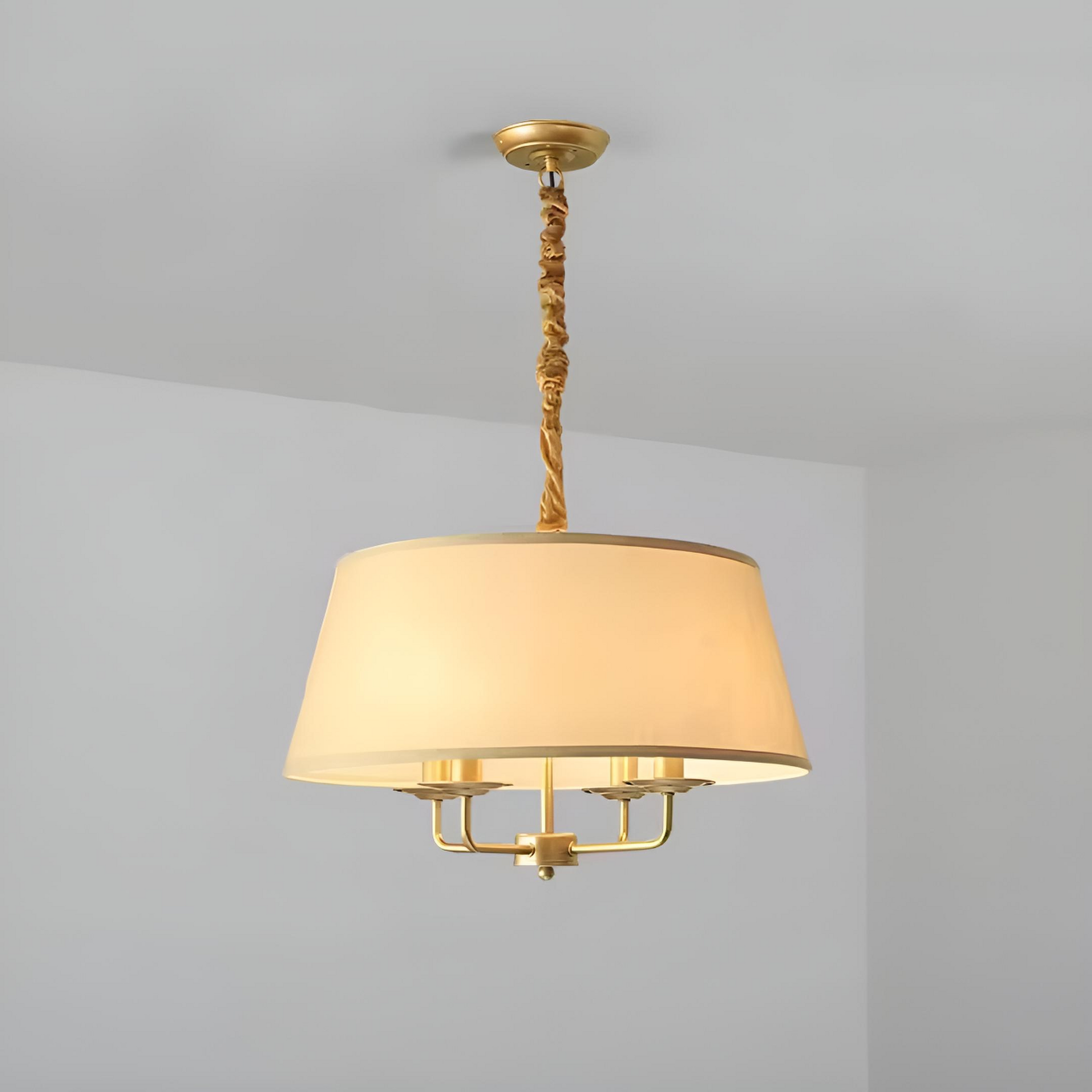 En elegant takpendel i retroinspirerad design med mjuk tygskärm och exklusiva mässingsdetaljer. Lampan har fyra ljuskällor som sprider ett behagligt ljus och skapar en varm atmosfär i rummet. Perfekt som belysning i sovrum, vardagsrum, matsal eller hotellmiljöer.