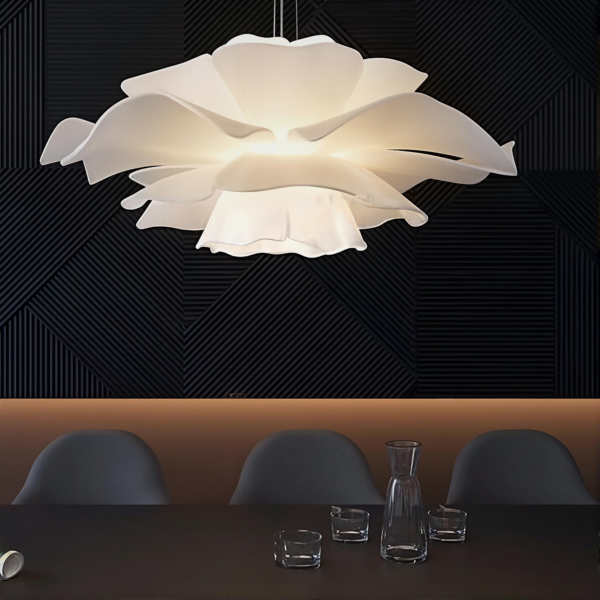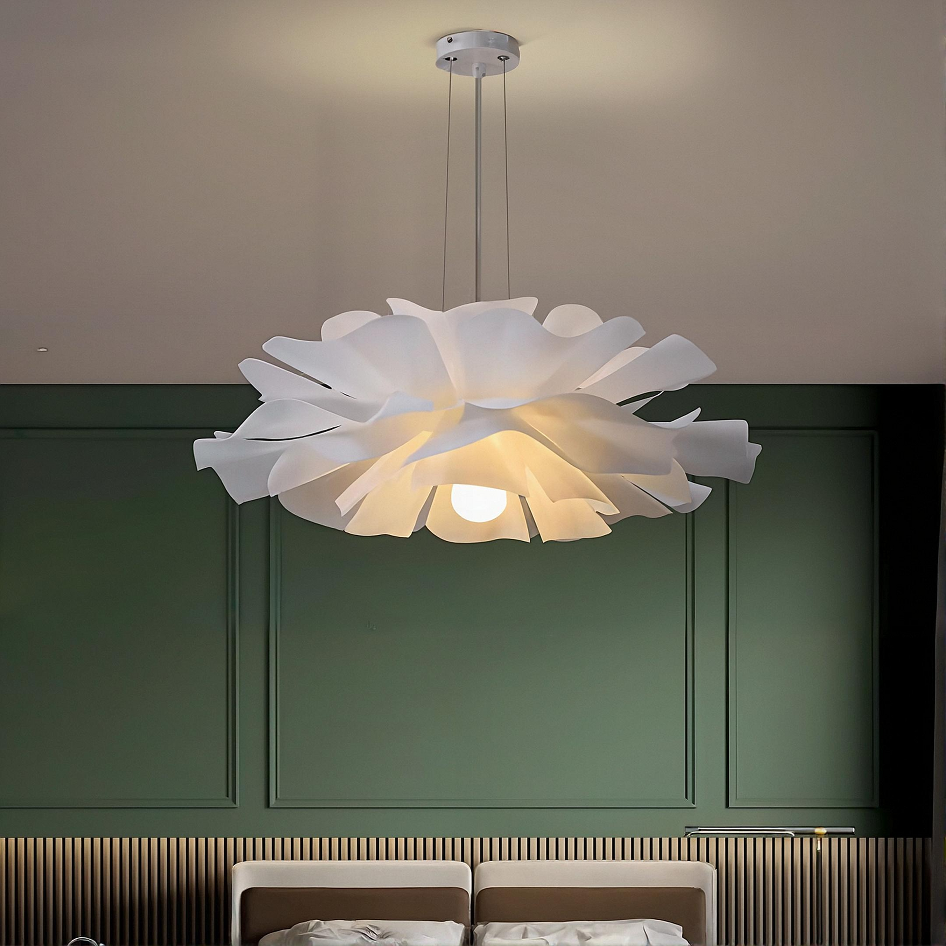 Den eleganta vita skärmen formar sig som blomblad och sprider ett varmt, jämnt ljus som passar perfekt över matbordet, i sovrummet eller vardagsrummet. Med sin kreativa design blir lampan både en dekorativ inredningsdetalj och en funktionell ljuskälla.