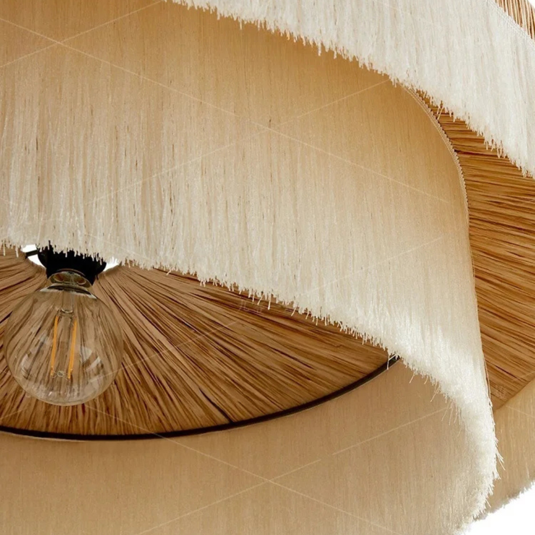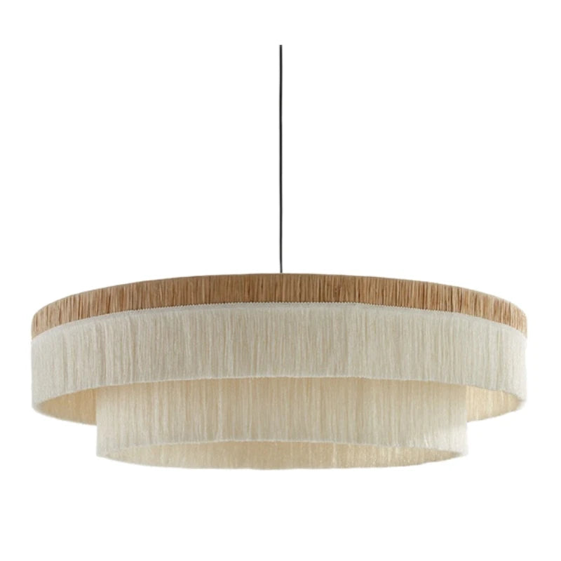 En unik takpendel i retroinspirerad design som kombinerar handknutet material med en varm och inbjudande ljusspridning. Den dekorativa fransskärmen skapar en elegant atmosfär och gör lampan till en vacker mittpunkt i vardagsrum, matsal eller sovrum. Perfekt för dig som vill addera både karaktär och mjuk belysning till ditt hem.