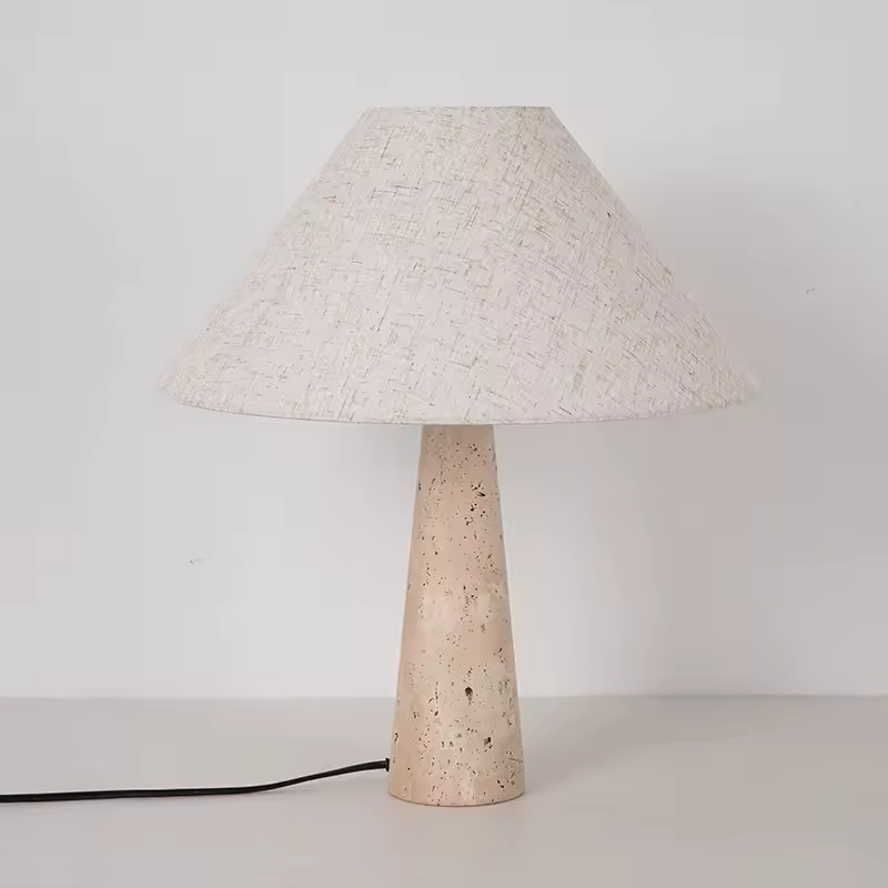 Tavra | Travertin bordslampa med linneskärm och varmt stämningsfullt ljus